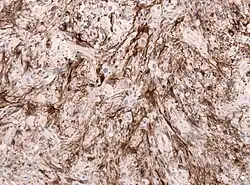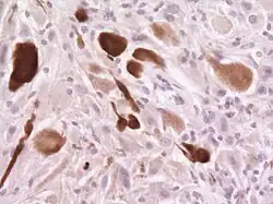 Histológicamente, son características de la lesión las células gigantes astrocíticas; sin embargo, la morfología de las células tumorales puede variar desde células poligonales con citoplasma vítreo y núcleos ganglioides hasta células fusiformes en una matriz fibrilar. Las células tumorales muestran una expresión variable de GFAP, S-100, sinaptofisina y neurofilamentos.