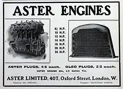 Desde mediados de la década de 1900, 'Aster-Wembley' fabricó motores bajo licencia para el Reino Unido en Wembley (Londres). En 1913, se convirtió en la 'Aster Engineering Co' que produjo motores aeronáuticos durante la Primera Guerra Mundial, y a partir de 1922, comenzó la producción de los automóviles Aster. En 1927 había sido absorbido por Arrol Johnston. En Italia, la Aster Società Italiana Motori suministró y fabricó automóviles y motores bajo licencia desde 1906-1908.
