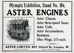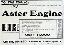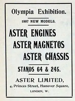 Un Aster de 12 hp se exhibió en el Salón del Automóvil del Crystal Palace de 1903, que sirvió para presentar la gama de automóviles Aster que se venderían en Gran Bretaña entre 1905 y 1907.