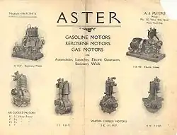 - ↑ Aster brochure of Myers, New York, 1900s. Listing Stationary motors; Electricity generator; Air cooled range; Water cooled range; and listing Gasoline motors, Kerosene motors and Gas Motors for Automobiles, launches, Electric generators and stationary work. Distributed in the USA by 'A J Myers', New York.