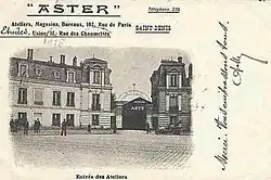 La empresa Aster se estableció en 1878 en el número 102 de la calle de París, en la localidad de Saint-Denis.[14] Las placas de identificación de los motores incluían el texto siguiente: «Ateliers de Construction Mécanique l'Aster». 74, Rue de la Victoire, París (domicilio social), Usines à St Denis (Seine) (fábrica).