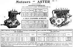 En el Salon de l'Auto de 1900 en París, Aster expuso un cuatriciclo equipado con su propio motor monocilíndrico de 3,5 CV. Los tamaños de motor y los motores de varios cilindros se desarrollaron progresivamente.[15]