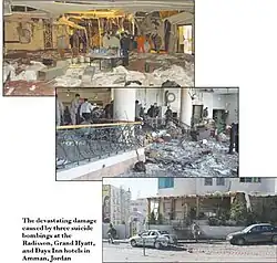 Los atentados del 9 de noviembre de 2005 en Amán fueron una serie de acciones terroristas coordinadas contra tres hoteles en la capital jordana el 9 de noviembre de 2005. Las explosiones, en el Grand Hyatt Hotel, el Radisson SAS Hotel y el Days Inn, comenzaron alrededor de las 20:50, hora local (18:50 UTC) en el Grand Hyatt.[1][2]