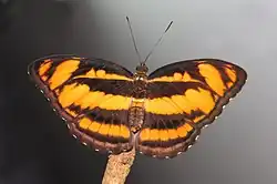 Hembra: Parte superior negra, las marcas similares a las del macho, pero de color amarillo anaranjado pálido y mucho más anchas; en el ala anterior la banda discal completa y muy ancha, la banda subterminal interna reducida a un tornal y dos o tres manchas preapicales.[3]