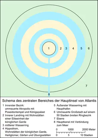 Tal prosperidad dio a los atlantes el impulso para construir grandes obras. Edificaron sobre la montaña rodeada de círculos de agua una espléndida acrópolis[15] plena de notables edificios, entre los que destacaban el Palacio Real y el templo de Poseidón.[16] Construyeron un gran canal, de 50 estadios de longitud, para comunicar la costa con el anillo de agua exterior que rodeaba la metrópolis; y otro menor y cubierto, para conectar el anillo exterior con la ciudadela.[17] Cada viaje hacia la ciudad era vigilado desde puertas y torres, y cada anillo estaba rodeado por un muro. Los muros estaban hechos de roca roja, blanca y negra sacada de los fosos, y recubiertos de latón, estaño y oricalco. Finalmente, cavaron, alrededor de la llanura oblonga, una gigantesca fosa a partir de la cual crearon una red de canales rectos que irrigaban todo el territorio de la planicie.[18]