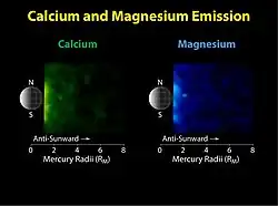 La cuarta especie detectada en la exosfera de Mercurio fue el sodio (Na). Fue descubierto en 1985 por Drew Potter y Tom Morgan, quienes observaron sus líneas de emisión Fraunhofer a 589 y 589,6 nm.[4] La densidad media de la columna de este elemento es de aproximadamente 1 × 1011 cm−2. Se observa que el sodio se concentra cerca de los polos, formando puntos brillantes.[5] Su abundancia también aumenta cerca del terminador del amanecer en comparación con el terminador del crepúsculo.[6] Algunas investigaciones han afirmado una correlación de la abundancia de sodio con ciertas características de la superficie como Caloris o puntos brillantes de radio;[4] sin embargo, estos resultados siguen siendo controvertidos. Un año después del descubrimiento del sodio, Potter y Morgan informaron que el potasio (K) también está presente en la exosfera de Mercurio, aunque con una densidad de columna dos órdenes de magnitud menor que la del sodio. Las propiedades y la distribución espacial de estos dos elementos son muy similares.[7] En 1998 se detectó otro elemento, el calcio (Ca), con una densidad de columna tres órdenes de magnitud inferior a la del sodio.[8] Las observaciones de la sonda MESSENGER en 2009 mostraron que el calcio se concentra principalmente cerca del ecuador, lo contrario de lo que se observa para el sodio y el potasio.[9] Otras observaciones de Messenger reportadas en 2014 señalan que la atmósfera se complementa con materiales vaporizados de la superficie por meteoros tanto esporádicos como en una lluvia de meteoros asociados con el cometa Encke.[10]
