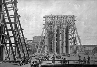 Al mismo tiempo, las cuadrillas de San Petersburgo prepararon la cimentación, el pedestal y el andamiaje; el costo estimado se duplicó, hasta los 2,36 millones de rublos. Montferrand convocó a un total de 2.090 soldados, oficiales y profesionales para erigir la columna, levantándola con seguridad el 30 de agosto de 1832.[15]​ Precisamente dos años después, el monumento fue inaugurado por Nicolás.[16][nb 4]​ Obtuvo Ricard el elogio del emperador le dirá: «¡Montferrand, se ha inmortalizado!». También recibió una pensión[17]​ y compró una mansión en el 86 Quai de la Moïka. En 1836-1837, Montferrand completó la plaza del Palacio con cercas y luces de gas. Preparó cinco diseños diferentes para el edificio que terminaría el lado del este de la plaza, pero el edificio del Cuerpo de Guardia fue asignado a Alexander Brullov.[18]