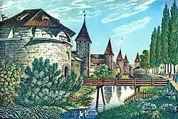 - ↑ Gebrüder Dürst. /befestigungen/stadtbefestigung_3_links/augustinerturm/augustinerturm.html «Augustinerturm» (en alemán). Gang dur Alt-Züri. Consultado el 17 de enero de 2015.