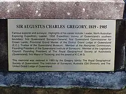 - ↑ a b Waterson, D. B. (1972). «Gregory, Sir Augustus Charles (1819–1905)». Australian Dictionary of Biography. Australian National University..
