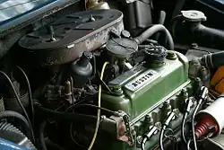 Motor 1300 cc Austin Morris, similar al usado por el MG 1300 MK II (obsérvese el doble carburador SU)