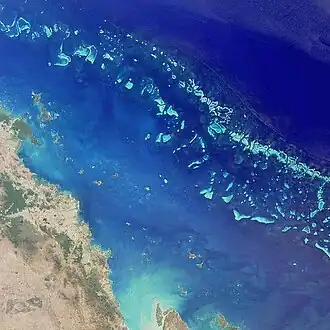 La Gran Barrera de Coral, el mayor arrecife de coral del mundo, se encuentra a poca distancia de la costa noreste y se extiende por más de 2000 km. El monte Augustos, considerado el mayor monolito del mundo,[189] se encuentra en Australia Occidental. Con 2228 m, el monte Kosciuszko es la montaña más alta de Australia continental. Aún más altos son el pico Mawson (con 2745 m), en el remoto territorio exterior australiano de la isla Heard, y, en el Territorio Antártico Australiano, el monte McClintock y el monte Menzies, con 3492 m y 3355 m respectivamente.[190]