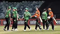 Las jugadoras se saludan tras la conclusión de un partido de la WBBL entre las Perth Scorchers y las Melbourne Stars, en el WACA Ground de Perth.