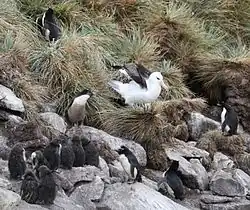 ![]() Albatros de ceja negra (Thalassarche melanophrys) y pingüinos penacho amarillo (Eudyptes chrysocome) | ||