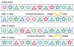 - La dinámica invertida en el tiempo del autómata puede ser descrita por otro autómata celular. Claramente, para que esto sea posible, la regla de actualización debe ser biyectiva. En la otra dirección, si la regla de actualización es biyectiva, entonces tiene una función inversa que también es biyectiva. Esta función inversa debe ser una regla de autómata celular.