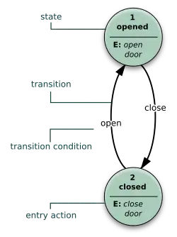 Los estados se refieren a las distintas condiciones que pueden darse en un escenario de uso o secuencia del sistema. Un ejemplo es un ascensor, que utiliza la lógica basada en el estado del sistema para realizar ciertas acciones en respuesta a su estado y a la entrada del operador. Por ejemplo, si el operador pulsa el botón de la planta n, el sistema responderá dependiendo de si el ascensor está parado o en movimiento, subiendo o bajando, o si la puerta está abierta o cerrada, y otras condiciones.[15]