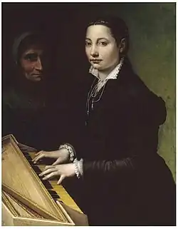 Un retrato de temática similar, donde aparece una joven tocando un virginal, fue realizado por la pintora flamenca Catharina van Hemessen que llegó a la Corte española en 1556, invitada por la gobernadora María de Habsburgo, hermana de Carlos I, tres años antes de que Sofonisba Anguissola llegara a Madrid como dama de honor de la reina Isabel de Valois.