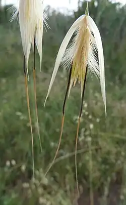 Planta con raíz fibrosa, densamente ramificada; con tallos herbáceos, erectos o, algunas veces, plegados en los nudos inferiores, de 40 a 60 cm de altura; hojas con lígula membranosa, limbo lanceolado de 10 a 20 cm de largo y 1 cm de ancho, ascendente y áspero el tacto; la inflorescencia es una panícula racemosa, abierta, de 10 a 30 cm de largo de espiguillas colgantes, sostenidas por pedicelos delgados, y que contienen 2 a 3 florecillas cubiertas por glumas de 2-3 cm de largo con nervaduras verdes prominentes y con pelos largos de color café en la base; dichas glumas sostienen, en la parte media del dorso, una arista de 3 a 4 cm de largo, doblada en su región media. El fruto es un cariópside alargado de 6 a 8 mm de longitud y de color claro.[cita requerida]
