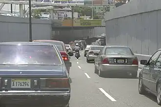 Tránsito en el paso a desnivel de la Av. 27 de Febrero con Av. Máximo Gómez en Santo Domingo.