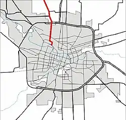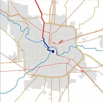 La avenida (en rojo) y las arterias (en azul) que las une al centro | ||
