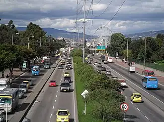 Avenida cerca al Parque Simón Bolívar al fondo la Rueda Millenium del Parque el Salitre.