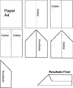 La realización de este tipo de avión de papel le lleva a una persona solamente siete pasos (para el procedimiento correcto), pero puede tomar solo cinco para completarlo sin doblar una guía para ayudar a dividir el papel en dos partes. Una pieza de papel rectangular como A3, A4 o Carta (preferentemente A4 o Carta) será usada.