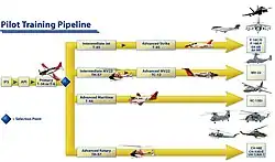 Después de la selección, los aviadores estudiantes son asignados a Entrenamiento de Vuelo Avanzado en su campo particular de especialización (aeronaves de reacción, a hélice o de alas giratorias). Al completar esa fase, los estudiantes son designados como Aviadores Navales y se les entrega su Insignia de Aviador Naval. Desde ese punto, ellos son entrenados en un Escuadrón de Reemplazo para la Flota para la aeronave específica que ellos volarán. Unos pocos aviones poco comunes son enseñados por la Armada o la Fuerza Aérea, o en el caso del HMX-1, por la compañía que fabricó la aeronave.[40] Después de terminar su período allí, los aviadores son asignados a su primer escuadrón.