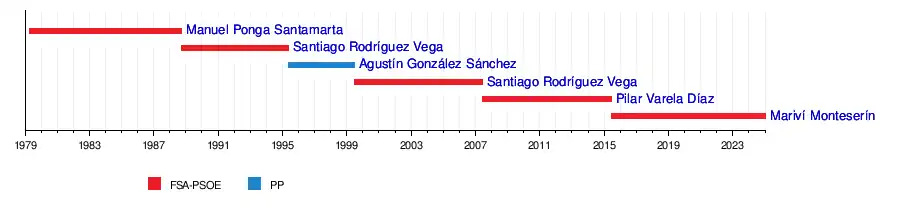El primer alcalde después de la transición, fue el socialista Manuel Ponga Santamarta, quien alcanzó la alcaldía tras un pacto de gobierno con el Partido Comunista de Asturias, ya que no había logrado ser la lista más votada. En 1983, consiguió una amplísima mayoría absoluta que le permitió gobernar en solitario. En 1988, fue nombrado delegado del Gobierno del Principado de Asturias, dejando la alcaldía en manos del también socialista Santiago Rodríguez Vega, y tras haber ganado nuevamente las elecciones de 1987, esta vez sin mayoría absoluta.