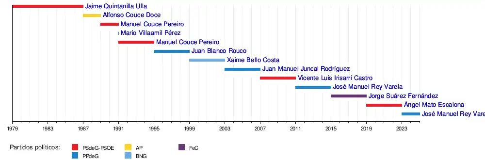 | 1991–1995 | Gobierno de 89 días del PPdeG, con Mario Villaamil Pérez. Substituido por Manuel Couce Pereiro en moción de censura del PSdeG-PSOE + EU-IU |