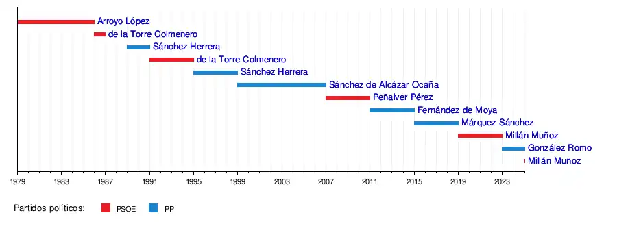 Desde la llegada de la democracia y durante los años ochenta la preeminencia del Partido Socialista Obrero Español fue casi absoluta, ganando sucesivamente y con contundencia una tras otra, todas las convocatorias electorales (generales, autonómicas y municipales). Así, en clave municipal, desde finales de la década de los setenta y década de los ochenta fueron socialistas quienes ocuparon el puesto de máximo regidor: Emilio Arroyo López y José María de la Torre Colmenero. Siendo este último desbancado de la alcaldía a finales de los ochenta por una moción de censura que aupó al puesto de primer edil a Alfonso Sánchez Herrera (Alianza Popular) con el apoyo del hoy ya extinto CDS.