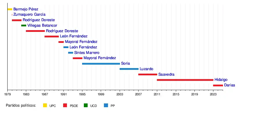 Gobierno 2023-2027 (15)[1] 12 PSOE 1 NC 1 Podemos 1 No adscrito[2] Oposición (14) 9 PP 4 Vox 1 CC | |