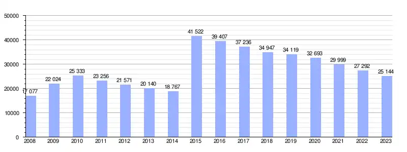 Gráfica de evolución de la deuda viva del Ayuntamiento entre 2008 y 2023