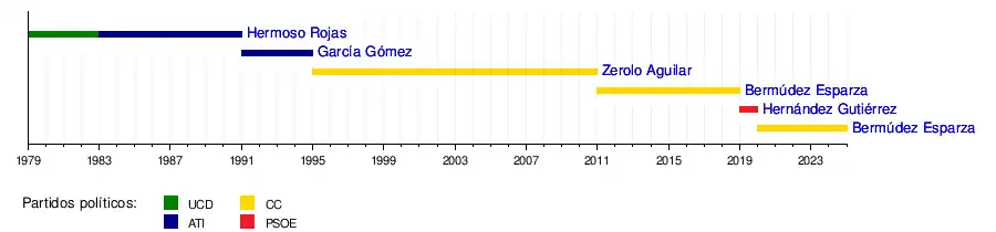 En la actualidad el cargo de Alcalde-Presidente lo ostenta José Manuel Bermúdez Esparza, que está al frente de un gobierno integrado por el Partido Popular y la concejal no adscrita y expulsada del partido con el que concurrió a las elecciones (Ciudadanos), Evelyn Alonso, tras incumplir la disciplina de voto de partido y apoyar la moción de censura contra Patricia Hernández Gutiérrez, del PSOE, que lideraba la corporación gracias a un pacto entre socialistas y Ciudadanos-Partido de la Ciudadanía.