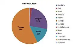 El Imperio de Massina tomó el control de Tombuctú en 1826, manteniéndolo hasta 1865, cuando fueron expulsados por El Hadj Umar Tall. Las fuentes están en conflicto sobre quien estaba en control cuando llegaron los franceses, Elias N. Saad en 1983 sugirió a los Soninke Wangara,[28] un artículo de 1924 en el diario de la Real Sociedad Africana menciona a los tuaregs,[30] mientras que el africanista John Hunwick no determina un mandatario, pero anota a varios estados compitiendo por el poder 'en una manera sombría' hasta 1893.[31]
