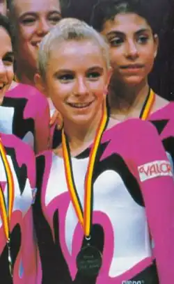 - ↑ Como «competición internacional oficial» se entienden aquellas competiciones internacionales organizadas por la Federación Internacional de Gimnasia (FIG), por sus organismos continentales (como la Unión Europea de Gimnasia) o por el Comité Olímpico Internacional (junto a la FIG). Se incluirían por tanto Juegos Olímpicos, Preolímpicos, Campeonatos Mundiales, Campeonatos Europeos y pruebas de la Copa del Mundo, así como competiciones extintas tales como la Final de la Copa del Mundo, la Final de la Copa de Europa, el Campeonato Europeo Júnior (ahora integrado dentro del Campeonato Europeo), el Euromasters, y el Campeonato Europeo por Equipos (sucesor del Euromasters). No se incluyen bajo este término competiciones únicamente patrocinadas por dichos organismos, como los Juegos Mediterráneos o los Juegos Mundiales en el caso del COI, o el Grand Prix en el caso de la UEG.