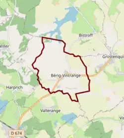 Bérig-Vintrange es una población y comuna francesa, en la región de Lorena, departamento de Mosela, en el distrito de Forbach y cantón de Grostenquin.