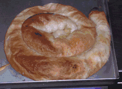 En Albania este plato se denomina "byrek" (que en albanés significa: pastel). La mayoría de los pasteles de la cocina albanesa no son dulces, y se pueden encontrar salados, contienen carne o cualquier verdura. Se sirve con los platos principales.