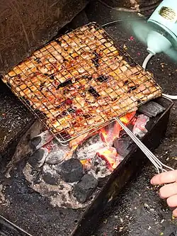 Luego de marinar, la carne se ensarta en brochetas o se coloca en planchas y se asa sobre brasas. Una vez que la carne esté cocida y fragante, se añade a un recipiente con salsa de pescado que se mezcla con sabores agridulces, picantes y salados, y se combina con papaya verde (o colinabo, zanahorias) previamente mezclada con vinagre. Este plato de salsa de pescado se puede disfrutar tal cual, junto con fideos y vegetales crudos, que incluyen lechuga, cilantro, albahaca Lang, mejorana, perilla y brotes de soja.