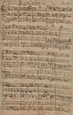 para el compás de tiempo común (4/4).[14][26] Los instrumentos se muestran por separado para vientos y cuerdas, mientras que no se muestra el bajo continuo, ya que toca durante toda la obra.