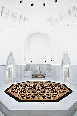 El vestidor masculino tiene forma rectangular y está cubierto por una cúpula, que está rodeada por un friso de hojas en zigzag en técnica decorativa ablaq. La sala tiene nichos de arco apuntado en cada uno de sus cuatro costados. A un lado del cuarto fresco, techado con tres cúpulas, se encuentran los baños y al otro lado un cuarto de afeitado. Una puerta conduce a la sala caliente (en forma de cruz), que tiene cuatro logias con fuentes en las esquinas y cuatro cubículos independientes para el retiro (halvet) debajo de una pequeña cúpula. En el centro de la sala caliente, se encuentra una gran mesa octagonal de mármol y piedra llamada göbek taşı (literalmente: piedra de la barriga), en la que se acuestan los bañistas. Se sabe que esta área estaba antiguamente decorada con mosaicos. La gran cúpula de la sala caliente, que se asienta sobre las paredes de forma octogonal, tiene pequeñas ventanas de vidrio para crear una media luz desde la parte superior. La sección de mujeres tiene el mismo plano arquitectónico que la de hombres, si bien, su vestidor es un poco más pequeño.