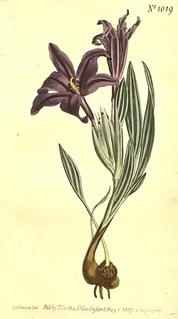 Es una planta con hojas basales, ensiformes, pecioladas, plegadas, pilosas, que rebasan la inflorescencia; flores en algunas o varias espigas densas; en espata lanceolada exterior; el perianto de color lila profundo; en forma de tubo con la parte superior en forma de embudo.[2]