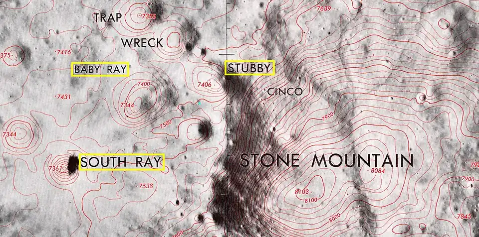 - ↑ Apollo 16 Landing Area, 78D2S1(50), NASA Lunar Topophotomap. Published by The Defense Mapping Agency, November 1974. Available from Lunar and Planetary Institute.