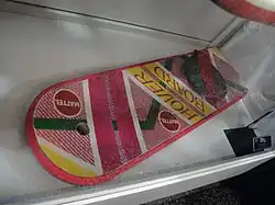 - El concepto de hoverboard - un monopatín que puede flotar desde el suelo - ha sido explorado por varios grupos desde el lanzamiento de la película. Se han demostrado intentos similares a los de los botes flotantes, que disparan aire en el suelo,[30] con una distancia récord de 2015 de 275 metros.[31] Un tipo diferente es el MagBoard, desarrollado por investigadores de la Universidad de París Diderot. Utiliza una gran placa en la parte inferior superconductor enfriada con nitrógeno líquido para lograr el Efecto Meissner y permitir que flote sobre una pista especial; Se mostró capaz de soportar el peso de un humano en su demostración práctica. Sin embargo, el requisito de ejecutar el superconductor a temperaturas más altas y más altas evita que esto sea práctico.[32][33] En marzo de 2014, una compañía llamada HUVr Tech supuestamente demostró un hoverboard en funcionamiento junto con varias celebridades, incluida Lloyd, aunque esto se reveló en breve como un engaño creado por el sitio web Funny or Die.[34] Los aeropatines se hicieron populares en 2015 a pesar de que no flotan por encima del suelo.[35]