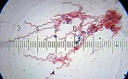 - Actinobacteria en forma de filamentos. Dichos filamentos suelen rodearse de una vaina que contiene multitud de células individuales, pudiendo llegar a ramificarse, como el género Nocardia, adquiriendo así el aspecto del micelio de un hongo.[57]