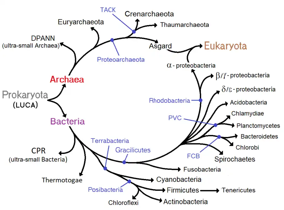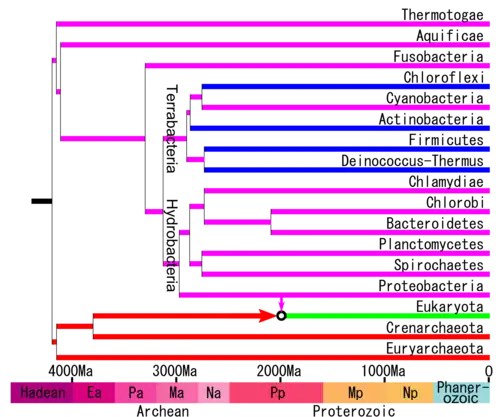 Se ha sugerido que el último antepasado común universal de bacterias y arqueas es un termófilo que vivió hace 4200 millones de años durante el Hádico. La bifurcación entre arqueas y bacterias se produjo a mediados del Hádico hace 4150 millones de años, mientras que los eucariotas son más recientes y surgieron a comienzos del Paleoproterozoico hace 2500 millones de años. La mayoría de los filos bacterianos se originaron durante el Arcaico. Las bacterias termófilas del reino Thermotogati y Fusobacteriota se separaron del resto de las bacterias a finales del Hádico y a comienzos del Arcaico. Los grandes reinos bacterianos Pseudomonadati y Bacillati se originaron a mediados del Arcaico.[39][32][33]