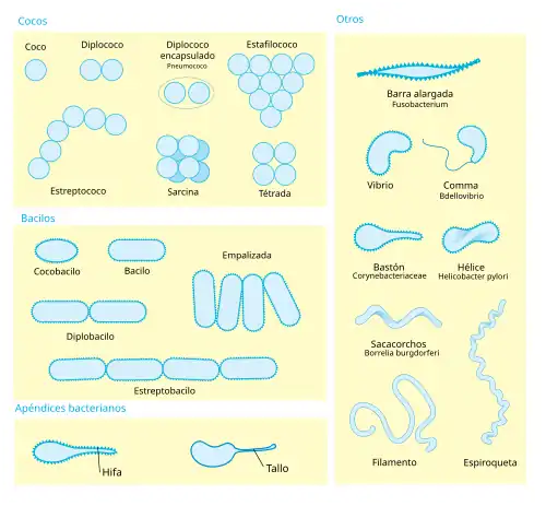 - Bacilo (del latín baculus, varilla): en forma de bastoncillo.