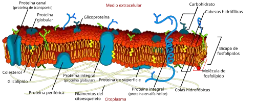 La membrana citoplasmática bacteriana tiene una estructura similar a la de plantas y animales. Es una bicapa lipídica compuesta fundamentalmente de fosfolípidos en la que se insertan moléculas de proteínas. En las bacterias realiza numerosas funciones entre las que se incluyen las de barrera osmótica, transporte, biosíntesis, transducción de energía, centro de replicación de ADN y punto de anclaje para los flagelos. A diferencia de las membranas eucarióticas, generalmente no contiene esteroles (son excepciones micoplasmas y algunas proteobacterias), aunque puede contener componentes similares denominados hopanoides.