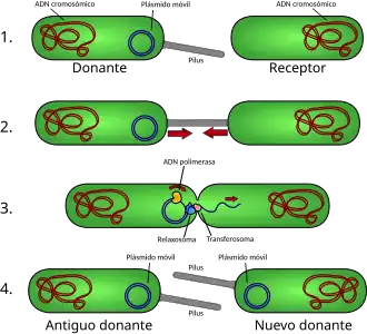 Por otro lado, cabe destacar un tipo de reproducción sexual en bacterias, denominada parasexualidad bacteriana. En este caso, las bacterias son capaces de intercambiar material genético en un proceso conocido como conjugación bacteriana. Durante el proceso una bacteria donante y una bacteria receptora llevan a cabo un contacto mediante pelos sexuales huecos o pili, a través de los cuales se transfiere una pequeña cantidad de ADN independiente o plásmido conjugativo. El mejor conocido es el plásmido F de E. coli, que además puede integrarse en el cromosoma bacteriano. En este caso recibe el nombre de episoma, y en la transferencia arrastra parte del cromosoma bacteriano. Se requiere que exista síntesis de ADN para que se produzca la conjugación. La replicación se realiza al mismo tiempo que la transferencia.