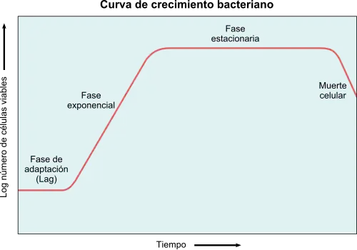 El crecimiento bacteriano sigue tres fases. Cuando una población bacteriana se encuentra en un nuevo ambiente con elevada concentración de nutrientes que le permiten crecer necesita un período de adaptación a dicho ambiente. Esta primera fase se denomina fase de adaptación o fase lag y conlleva un lento crecimiento, donde las células se preparan para comenzar un rápido crecimiento, y una elevada tasa de biosíntesis de las proteínas necesarias para ello, como ribosomas, proteínas de membrana, etc.[118] La segunda fase de crecimiento se denomina fase exponencial, ya que se caracteriza por el crecimiento exponencial de las células. La velocidad de crecimiento durante esta fase se conoce como la tasa de crecimiento k y el tiempo que tarda cada célula en dividirse como el tiempo de generación g. Durante esta fase, los nutrientes son metabolizados a la máxima velocidad posible, hasta que dichos nutrientes se agoten, dando paso a la siguiente fase. La última fase de crecimiento se denomina fase estacionaria y se produce como consecuencia del agotamiento de los nutrientes en el medio. En esta fase las células reducen drásticamente su actividad metabólica y comienzan a utilizar como fuente energética aquellas proteínas celulares no esenciales. La fase estacionaria es un período de transición desde el rápido crecimiento a un estado de respuesta a estrés, en el cual se activa la expresión de genes involucrados en la reparación del ADN, en el metabolismo antioxidante y en el transporte de nutrientes.[119]