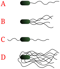 Según el número y disposición de los flagelos en la superficie de la bacteria se distinguen los siguientes tipos: un solo flagelo (monotrico), un flagelo en cada extremo (anfitrico), grupos de flagelos en uno o en los dos extremos (lofotrico) y flagelos distribuidos sobre toda la superficie de la célula (peritricos). En un grupo único de bacterias, las espiroquetas, se presentan unos flagelos especializados, denominados filamentos axiales, localizados intracelularmente en el espacio periplásmico, entre las dos membranas. Estos producen un movimiento rotatorio que hace que la bacteria gire como un sacacorchos desplazándose hacia delante.[107]