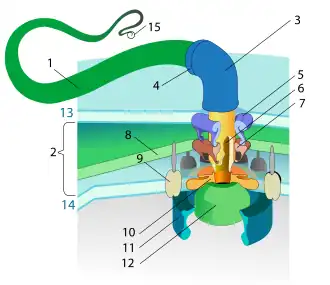 El flagelo bacteriano es un largo apéndice filamentoso helicoidal propulsado por un motor rotatorio (como una hélice) que puede girar en los dos sentidos. El motor utiliza como energía un gradiente electroquímico a través de la membrana. Los flagelos están compuestos por cerca de 20 proteínas, con aproximadamente otras 30 proteínas para su regulación y coordinación.[107] Hay que tener en cuenta que, dado el tamaño de la bacteria, el agua les resulta muy viscosa y el mecanismo de propulsión debe ser muy potente y eficiente. Los flagelos bacterianos se encuentran tanto en las bacterias Gram-positivas como Gram-negativas y son completamente diferentes de los eucarióticos y, aunque son superficialmente similares a los arqueanos, se consideran no homólogos.